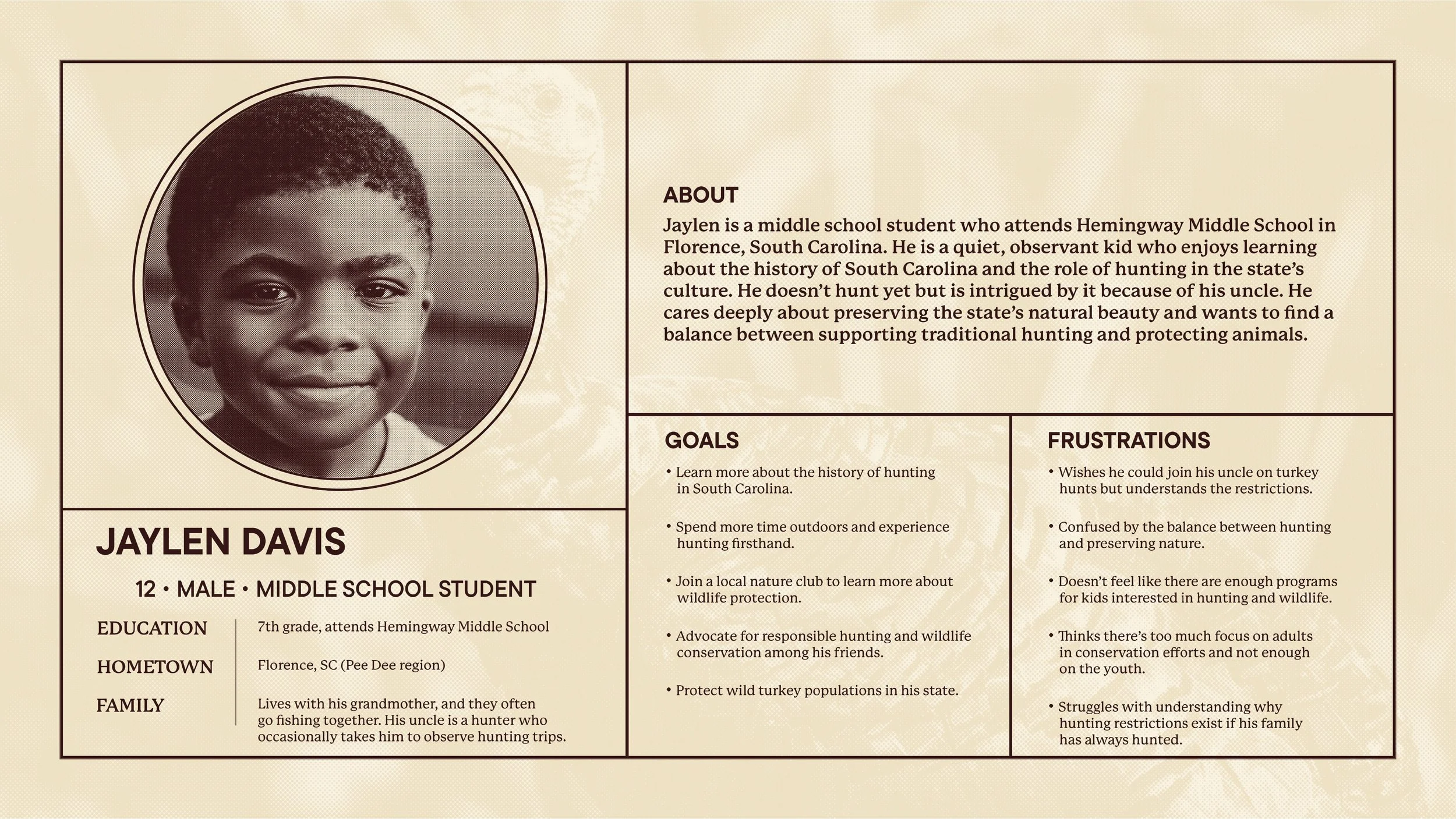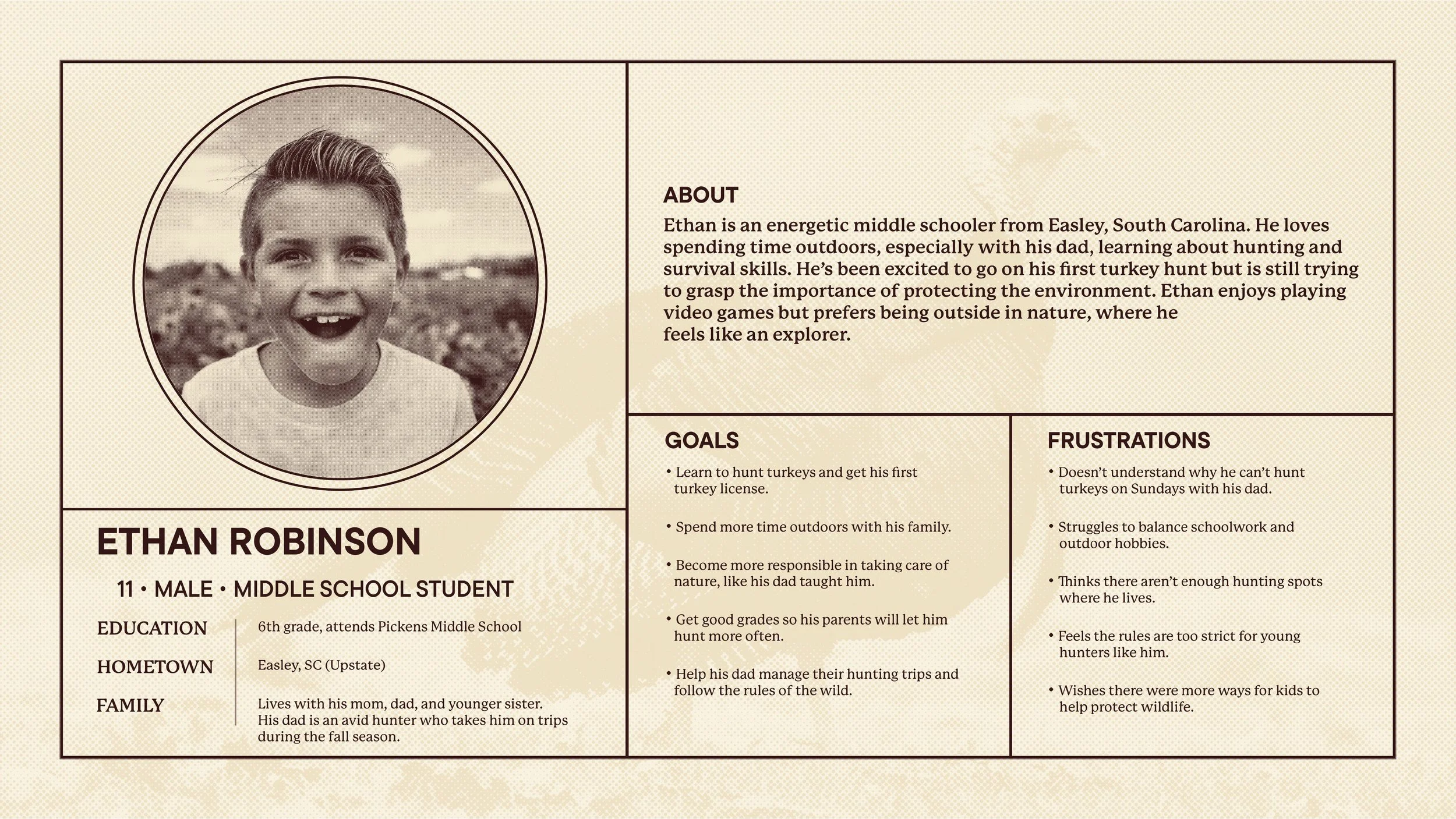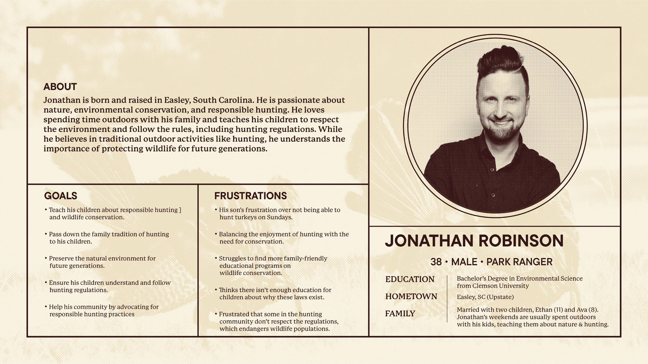 Did you know? It is prohibited by law to hunt wild turkeys on Sundays in South Carolina. The goal for this ad campaign is to educate the public and spread awareness of the declining turkey population in South Carolina. Explore how I crafted a brand identity and visual assets for the Hunt With Care ad campaign.