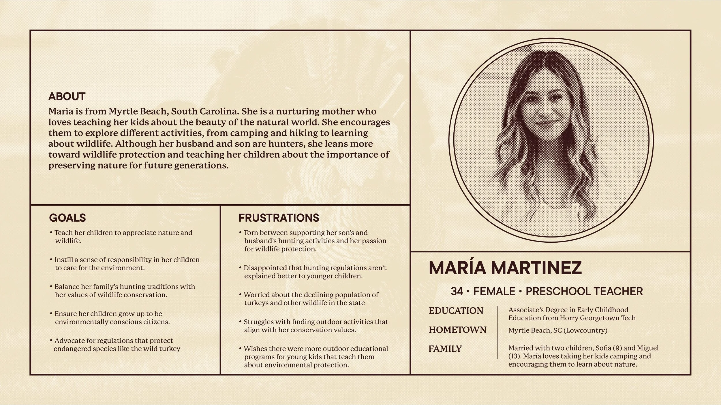 “Hunt with Care” ad campaign embodying the caregiver and innocent archetypes, with a mascot symbolizing the caregiver’s protective nature towards wild turkeys and the innocent’s emphasis on purity and nature. The campaign aims to spread the message about the declining turkey population and the need to protect the species in South Carolina.